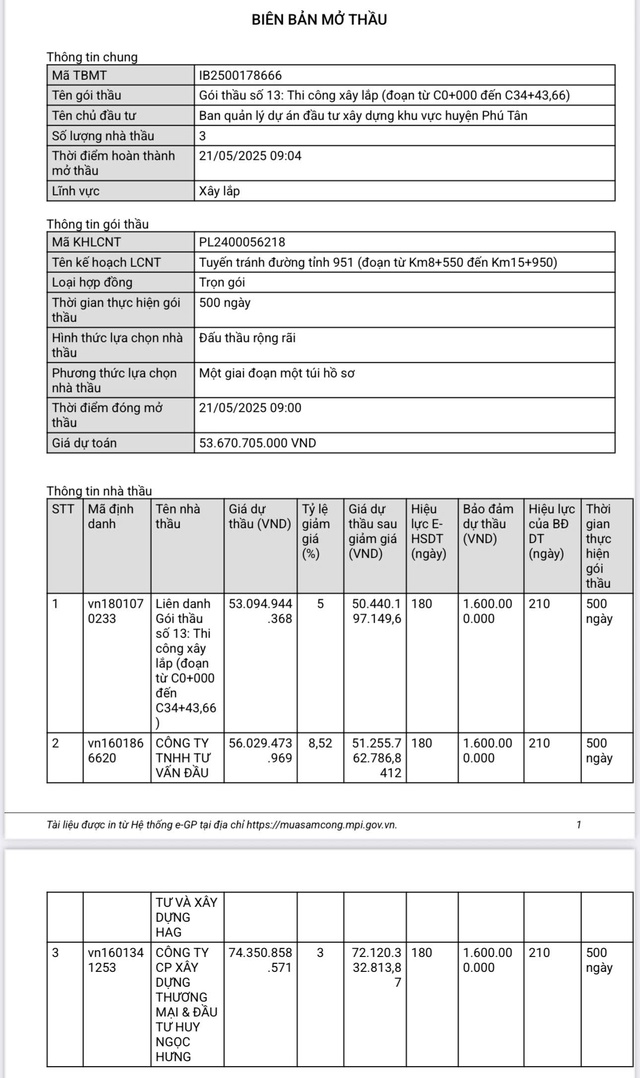 Vừa qua, ngày 21/05, Ban Quản lý dự án đầu tư xây dựng khu vực huyện Phú Tân (An Giang) đã mở thầu qua mạng gói thầu thi công xây lắp Tuyến tránh đường tỉnh 951 (đoạn Km8+550 đến Km15+950) với tổng mức đầu tư trên 53,6 tỷ đồng, có 3 nhà thầu nộp hồ sơ dự thầu.