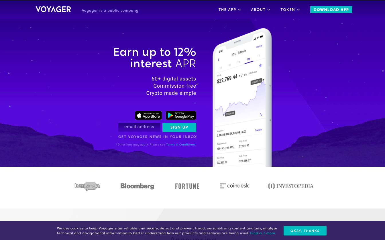 Công ty Voyager Digital là nền tảng tiền điện tử công khai được thành lập vào 2018. Voyager cho phép người dùng đầu tư và trao đổi hơn 60 loại tài sản số khác nhau, không có phí giao dịch, thông qua ứng dụng điện thoại đơn giản. Người dùng còn có thể nhận lãi suất lên đến 12% mỗi năm trên hơn 30 đồng tiền số khác nhau. Qua công ty con ApS, Voyager cho phép khách hàng giao dịch đơn giản bằng tiền điện tử ở khắp nơi trên thế giới.